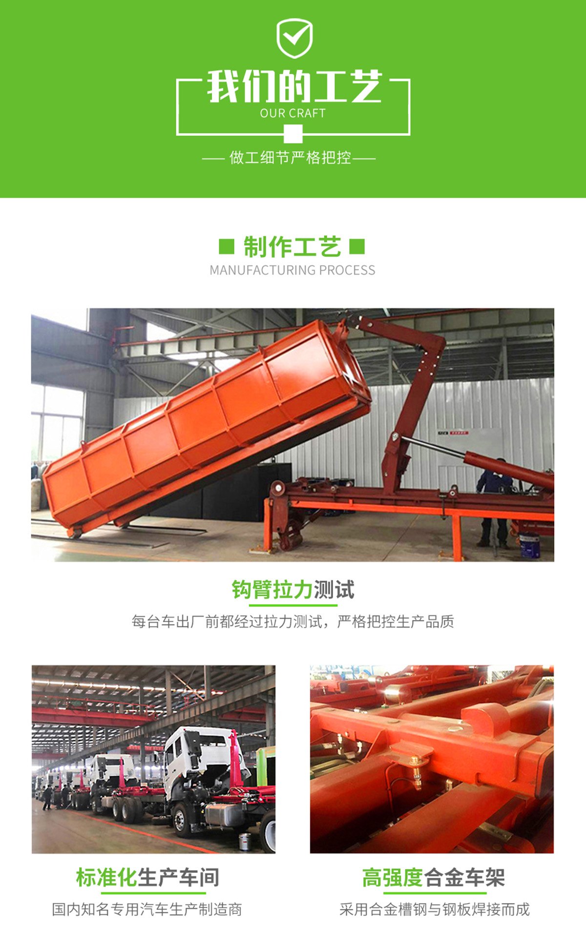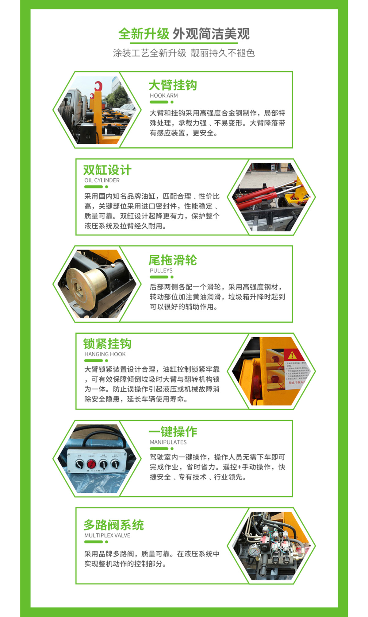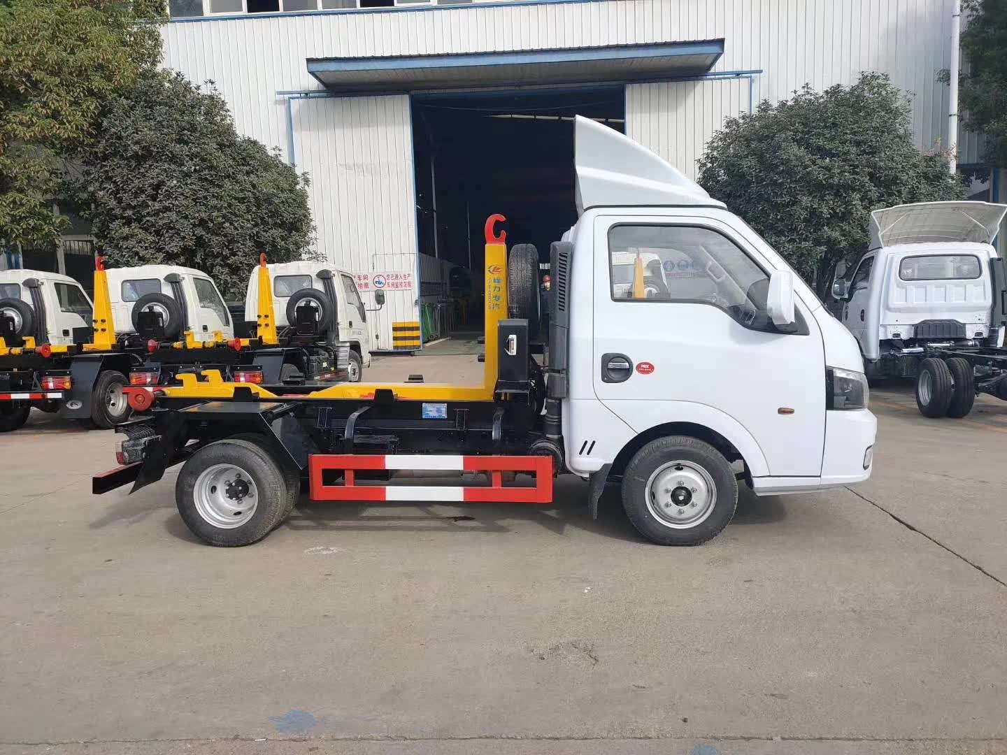 底盤配置:柳機113馬力,1650單排駕駛室,5檔變速箱,175R14真空輪胎【后雙輪】,前后橋1.5/2.5。標配動力轉向,前盤制動,中控門鎖,電動門窗,定速巡航,藍牙電話,LED日間行車燈,空調,預留取力器窗口。 上裝配置:勾臂垃圾車標配:由液壓系統、操作系統、拉臂,組成。舉升油制缸為國內知名液壓件廠家生產的雙作用油缸,多路閥液壓控制,操作員手動控制垃圾廂吊上放下,帶自卸功能,上下一次工作循環時間≤40秒。垃圾箱冷板壓制垃圾箱,帶后門密封圈,帶金屬滾動輪。 |